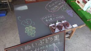 ぶどう販売用の台が新しくなりました。黒板の様に字が書けるシートを張り、ぶどうが綺麗にディスプレイできます。