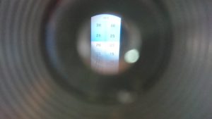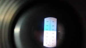 糖度を図ってみたところ糖度22との数値になりました。糖度計の筒をカメラで撮っているので、少し見づらいですが、20~25の真ん中程度に青と白の線が出ているのが分かります。