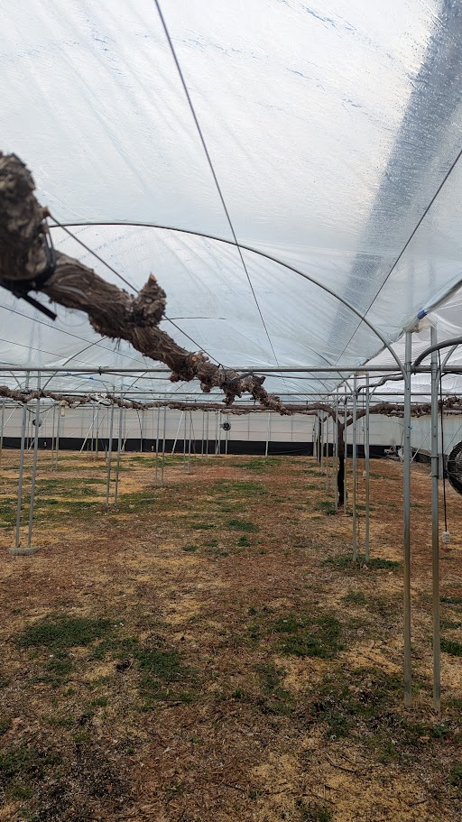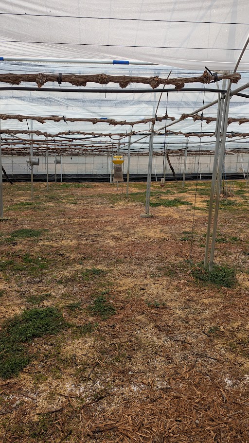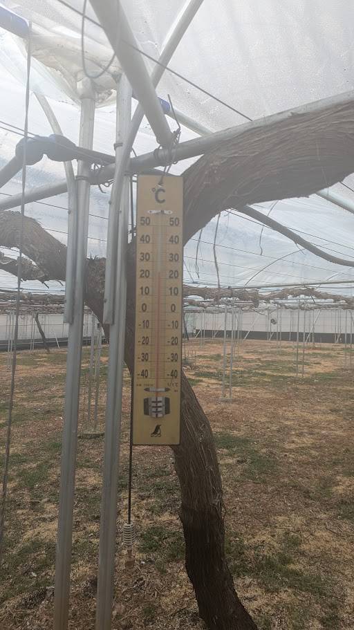 早速、圃場へ案内していただき、そこでいろろなお話を聞かけせていただきました。案内していただいた圃場の第一印象は、きれいに整頓され清潔感あふれる圃場だという事でした。葡萄の木は、短梢剪定で葡萄の木の幹が見事に直線上にきれいに整列していました。ハウスはドーム型で大阪でよく見かける波状ハウスとは違うものです。